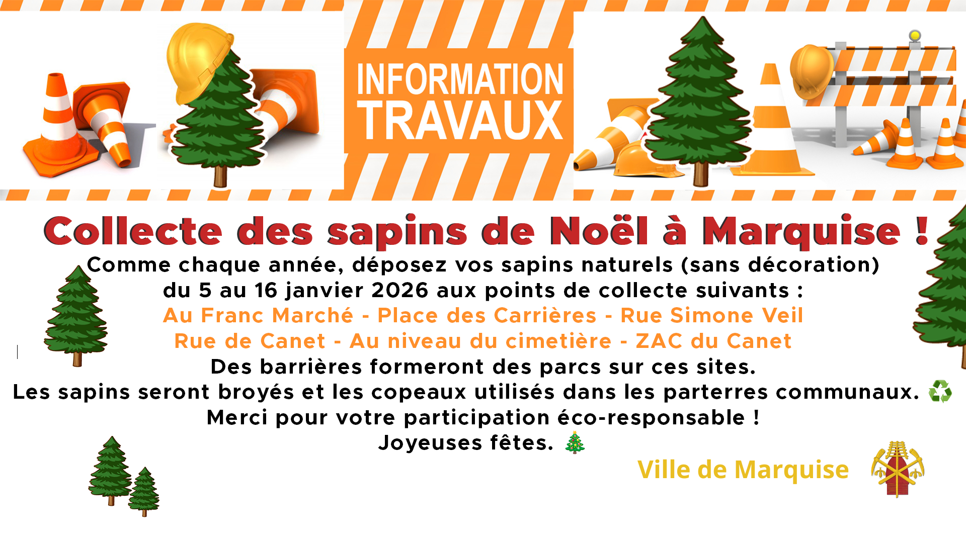 Comme chaque année, déposez vos sapins naturels (sans décoration) du 5 au 16 janvier 2026 aux points de collecte suivants :